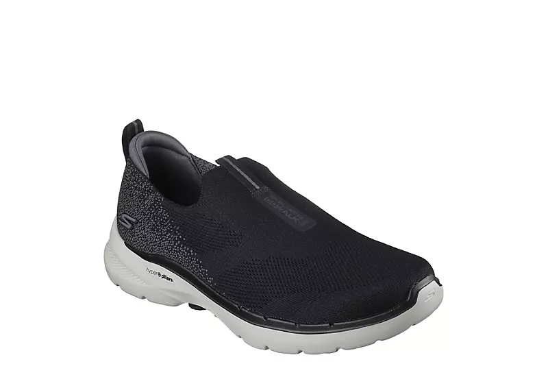 Walk lively with the Skechers GOwalk 6 men’s slip on shoe. With a breathable mesh upper featuring the ultra-lightweight, high-rebound Hyper Pillars for extra support, these slip-on walking sneakers are Stretch Fit for snugness. The Skechers Air-Cooled Goga Mat plus Ortholite comfort foam layer offer premium cushioning while the dual-density traction outsole is stable and durable.